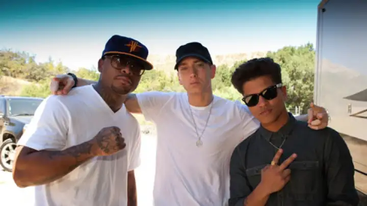 Um dos rappers mais bem sucedidos da atualidade está gravando um clipe com o cantor que não sai do primeiro lugar do Vagalume há meses: Eminem (no meio), Royce Da 5'9 (esquerda) e Bruno Mars (direita) estão na produção visual do single Lighters (feat. Bruno Mars).