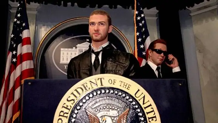 Mas, se depender dos responsáveis do museu Madame Tussauds, em Nova Iorque, Timberlake não vai voltar para a música tão cedo. Isso porque uma réplica de cera do cantor o coloca em um dos empregos mais difíceis do planeta: o de presidente dos Estados Unidos.