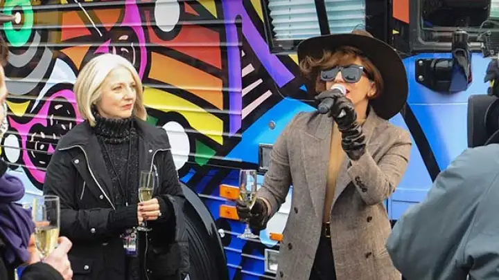 Lady Gaga E a cantora com sua mãe Cynthia inaugurando o Born Brave Bus
