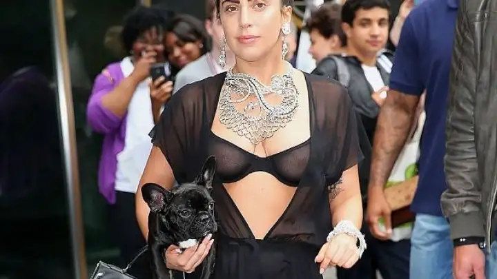 Depois de passar a semana circulando com um visual "anos 80", incluindo uma peruca gigantesca, Lady Gaga mudou novamente e ressurgiu com seu cabelo ao natural. No último dia 12, a estrela pop deixou seu prédio em Nova Iorque usando um simples coque, um vestido bem revelador e coberta de joias, acompanhada de sua cachorrinha Asia.
