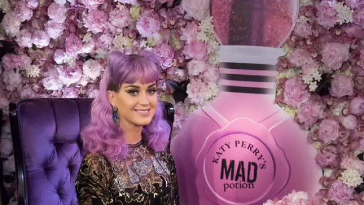 Aproveitando um período de folga da turnê "Prismatic", Katy Perry lançou na última semana sua nova fragrância Mad Potion em Los Angeles. Para combinar com o tema do perfume, a estrela pop compareceu ao evento usando um vestido de renda transparente adornado com joias bem chamativas e os cabelos no mesmo tom de roxo da embalagem.