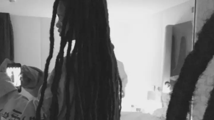 Na imagem, a barbadiana aparece em frente ao espelho exibindo os seus dreads longos.