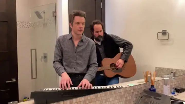 O The Killers, ou melhor, o vocalista e tecladista Brandon Flowers e Ronnie Vannucci Jr., que deixou a bateria de lado para tocar violão, fez uma apresentação direto do confinamento forçado pela crise do novo coronavírus para o talk show apresentado pelo comediante Jimmy Kimmel.