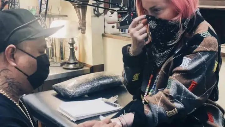 No pulso, Madonna registrou as iniciais "L R D M S E", simbolizando o nome de todos os filhos: Lourdes, Rocco, David, Mercy, Stella e Estere. "Tatuada pela primeira vez", escreveu a cantora na legenda das fotos, marcando o estúdio Shamrock Social Club, de Hollywood, e o tatuador East Iz.