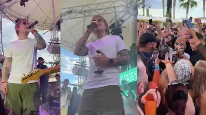 Nos vídeos divulgados nas redes sociais, o músico aparece após ser anunciado por um dos próprios donos do clube "O Beach Ibiza", surpreendendo a todos que estavam presentes. "Temos um convidado muito, muito especial na casa… temos a maior estrela pop do mundo. Vocês sabem quem é... senhoras e senhores, Sr. Ed Sheeran!".
