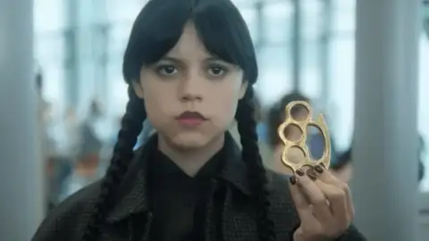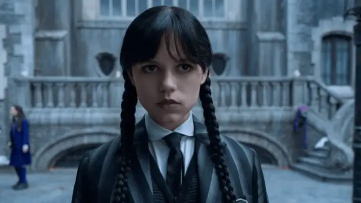 Jenna Ortega retorna no papel de Wandinha Addams, pronta para encarar os desafios da Academia Nunca Mais na segunda temporada da série "Wandinha", atualmente disponível na Netflix (Foto: Reprodução Netflix).