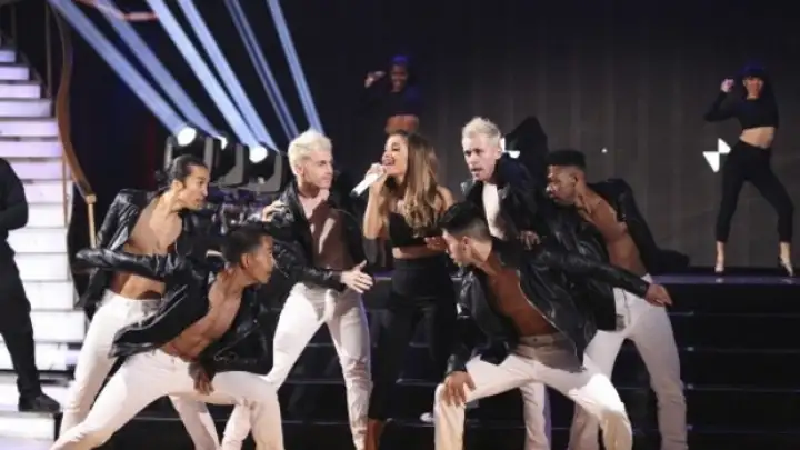 A cantora Ariana Grande e a rapper Iggy Azalea compareceram nesta terça-feira (20) a final do programa "Dancing With The Stars".