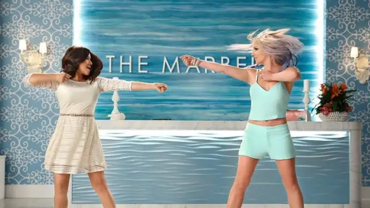 A imagem mostra a estrela pop dançando ao lado da protagonista do programa, Gina Rodruiguez, no saguão do Marbela.