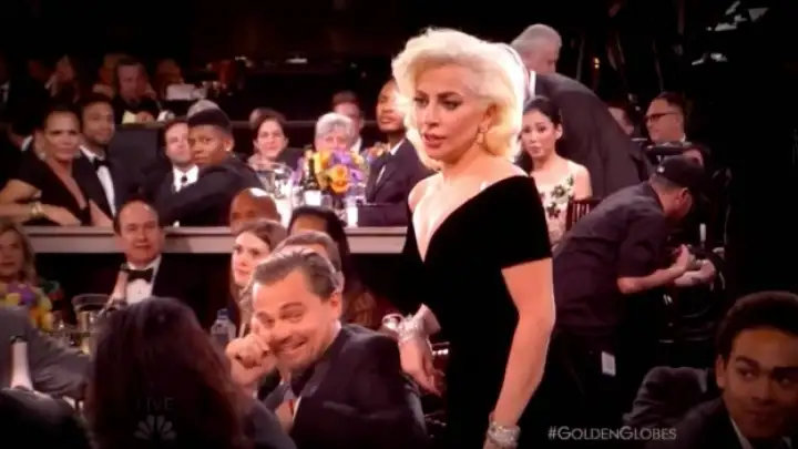 Emocionada, a Mother Monster não prestou atenção no que estava em seu caminho em direção ao palco para receber seu Globo de Ouro, e acabou esbarrando no ator Leonardo DiCaprio, que levou um susto ao ser alvo da cantora.