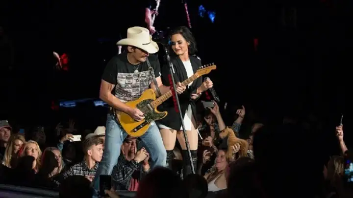 A americana subiu ao palco para fazer a primeira performance ao vivo de seu dueto com o cantor country, intitulado "Without a Fight (Feat. Demi Lovato)". "Essa é uma das maiores cantoras que vocês vão escutar", anunciou Brad ao surpreender os fãs com a aparição da morena.
