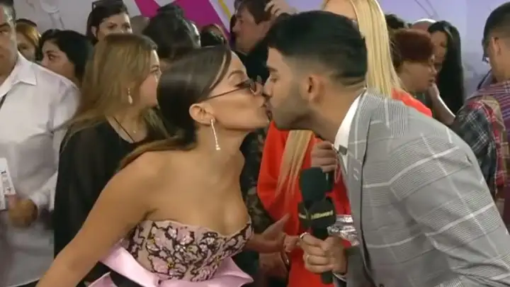 "Você quer me beijar?", perguntou a cantora ao repórter. Então, os dois deram um selinho em frente às câmeras.