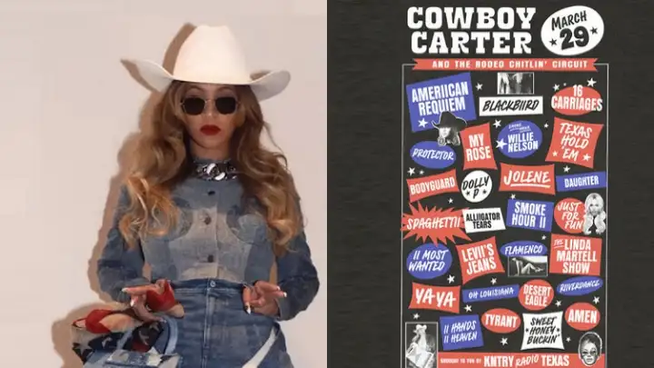 Há dois dias de seu lançamento, Beyoncé liberou o nome das músicas que estarão em "Cowboy Carter". Esta é a segunda parte, ou ato melhor dizendo, de sua trilogia de discos criados durante a pandemia. A postagem do Instagram indica que duas lendas do country, e da música americana em geral, estarão no disco: Dolly Parton e Willie Nelson.