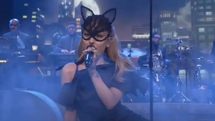 Na performance, a cantora usou uma máscara de gata, toda vestida de preto. Acompanhada de uma banda, Ariana mostrou mais uma vez porque é considerada uma das maiores vozes do pop moderno.