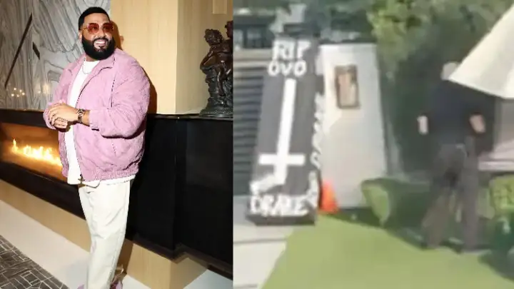 No caixão, estavam escritas em letras brancas as inscrições "RIP Drake" e "RIP OVO" (a gravadora do rapper canadense), além de uma cruz invertida. Em seguida, os dois indivíduos ajoelharam-se para rezar antes de partirem rapidamente.
