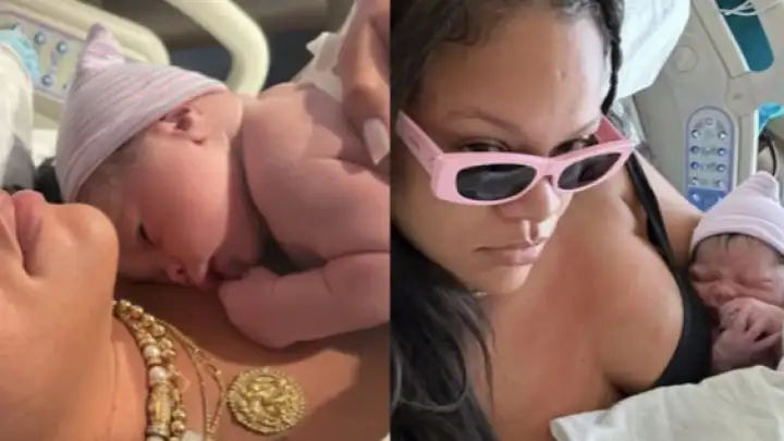 A primeira imagem mostra RZA Athelston Mayers deitado no peito da mãe, durante um momento essencial de contato pele a pele. A segunda foto exibe Rihanna usando óculos cor de rosa enquanto segura Riot Rose Mayers, que se aconchega a ela na cama do hospital.