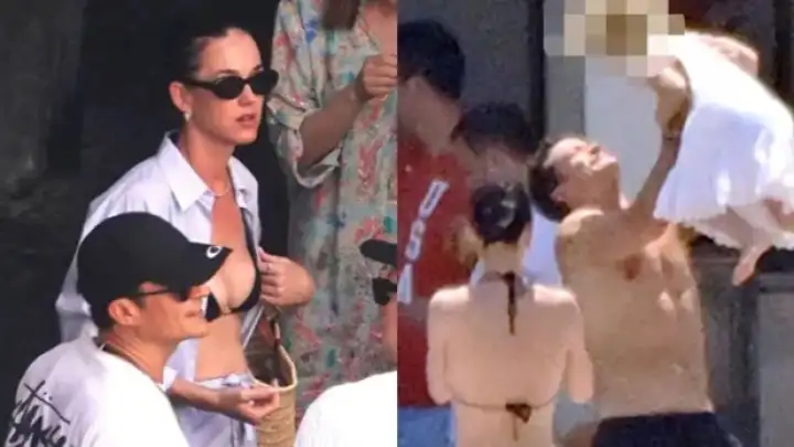 Em novas imagens compartilhadas pela Page Six, Katy aparece vestindo um biquíni preto enquanto Orlando optou por um short preto durante o passeio no iate de Jeff Bezos na Itália.