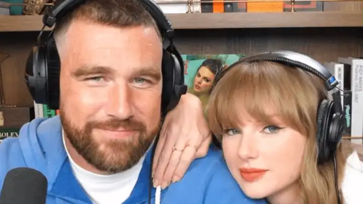 Taylor Swift e seu namorado, Travis Kelce, desmentiram os rumores de que ela apareceria no filme "O Maluco do Golfe 2" durante uma participação no podcast "New Heights" (Foto: New Heights/YouTube).
