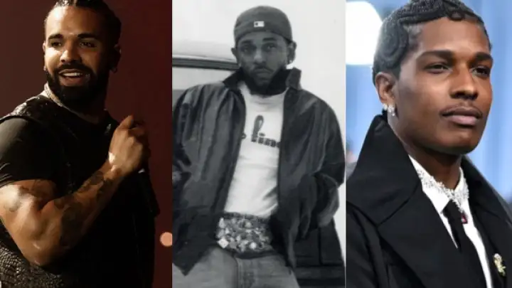 A$AP Rocky, parceiro e pai dos filhos de Rihanna, expressou sua opinião sobre o desentendimento público entre Kendrick Lamar e Drake, que acabou chegando à justiça (Foto: Reprodução Instagram / Instagram / Angela Weiss/AFP/Getty Images).